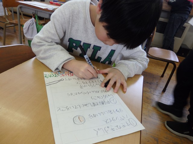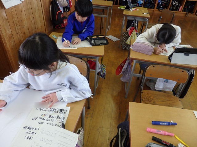 3年生の1時間目は国語の授業でした。「クラスの思い出作りのために」という学習です。実際に3年生の思い出を作るために、クラスでどんなことをしたらいいと思うかという提案文を書いていました。サッカー、バスケ、雪合戦、お絵かき伝言ゲーム、シール交換会、きつね狩りなどいろいろな提案文が書かれていました。自分の「やりたい」気持ちだけを書くのではなく、「それによってどんないいことがあるのか」などの理由もしっかり書いていました。