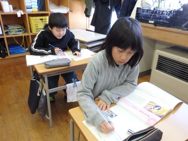 3年生の1時間目は国語の授業でした。「クラスの思い出作りのために」という学習です。実際に3年生の思い出を作るために、クラスでどんなことをしたらいいと思うかという提案文を書いていました。サッカー、バスケ、雪合戦、お絵かき伝言ゲーム、シール交換会、きつね狩りなどいろいろな提案文が書かれていました。自分の「やりたい」気持ちだけを書くのではなく、「それによってどんないいことがあるのか」などの理由もしっかり書いていました。