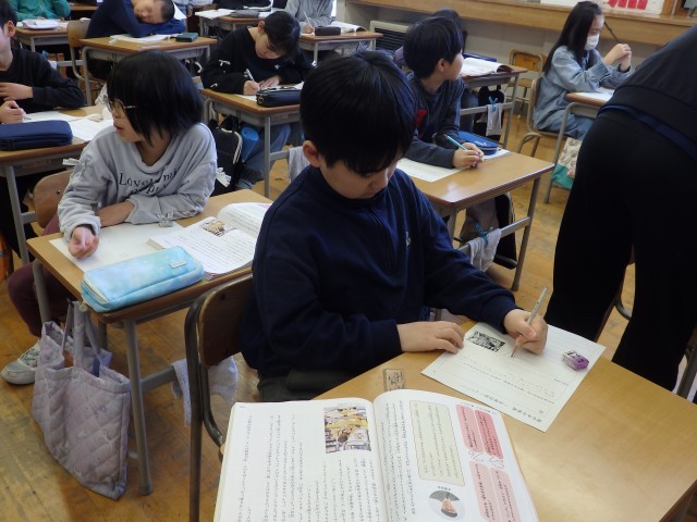 3年生の5時間目は図工の授業でした。席替えをしたようですね。紙版画の学習です。凸凹で模様が付いているいくつかの紙や毛糸などを貼り合わせて版画をします。今日は版画にする絵の下書きをしていました。タブレットで画像検索した絵を見ながら描いている子もいれば、何も見ないで描いている子もいました。トラック、日本庭園、飼っているペット、花などの絵を描いていました。「これを頑張って作るんだ」と描いた下絵を見ながら決意を語ってくれた子がいました。