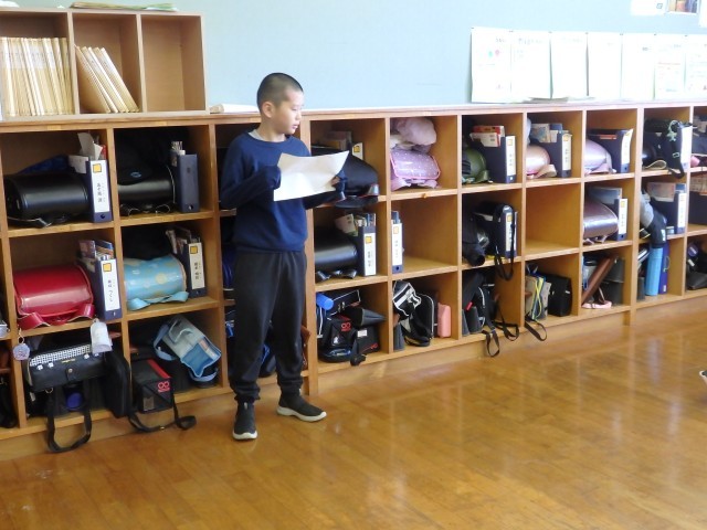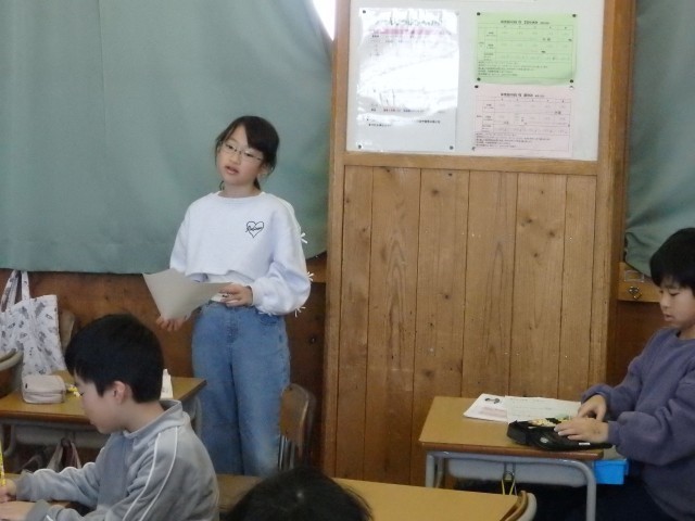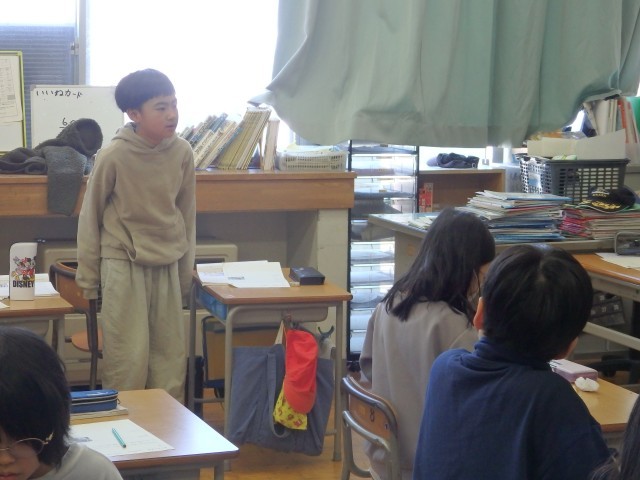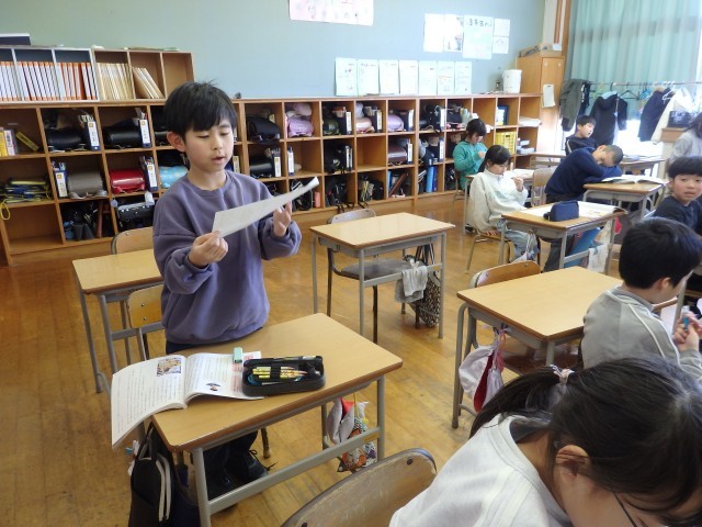 3年生の2時間目は国語の授業でした。「クラスの思い出づくりのために」という学習です。前の時間には「思い出を作るためにどんなことをしたらよいか」について、自分の提案を意見文として書きました。今日は意見文を班ごとで発表していきました。笑顔で発表していたり、発表が終わるとみんなで拍手したりする姿がいいですね。