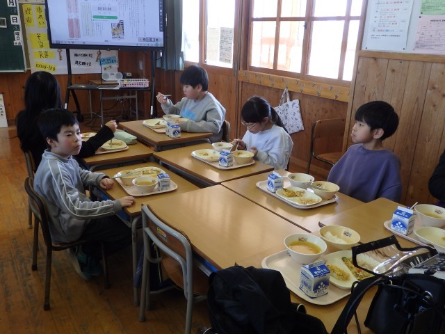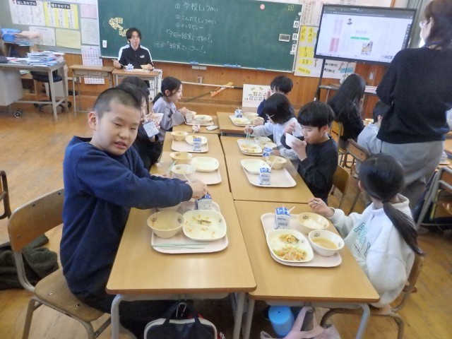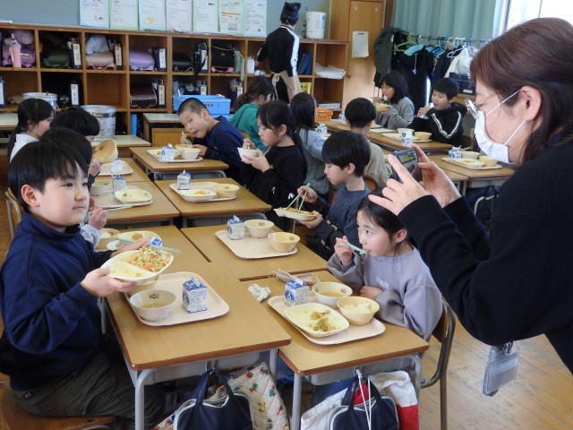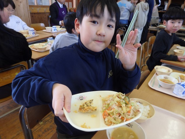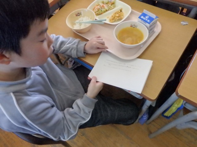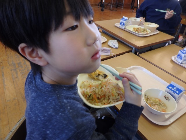 今日は3年生がFMゆきぐにの給食インタビューを受けます。インタビューが始まるまでの子どもたちの様子です。余ったおかずのジャンケンをしたり、お代わりをしたりしていました。写真のように野菜を大盛りにした子がいました。また、インタビューを受けたり、学校紹介をする子どもたちは「緊張するっ」と言いながら、話すことをメモした紙を読み返していました。