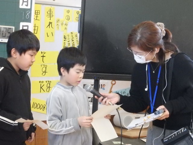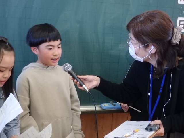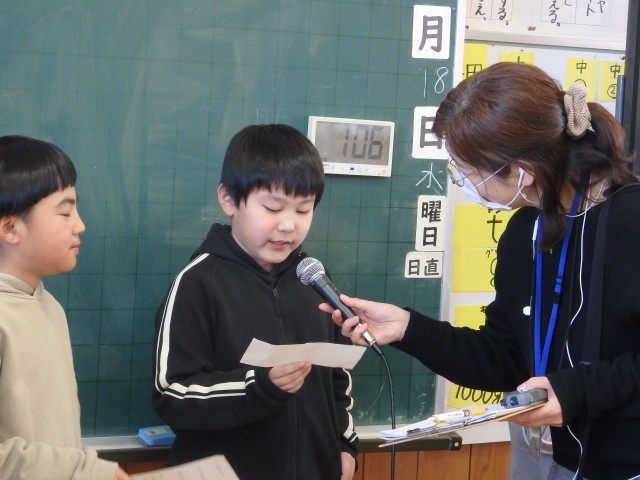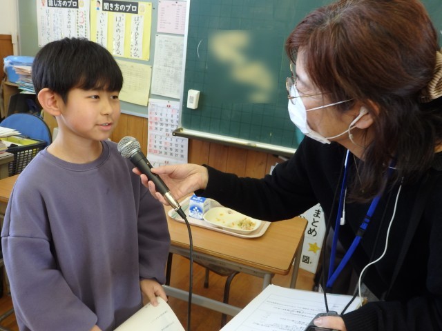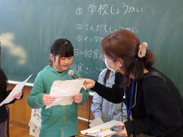 いよいよ給食インタビューが始まりました。学校のことを紹介したり、好きな食べ物・苦手な食べ物、学校で何をしているときが楽しいか、将来の夢などがインタビューされました。魚が好きな子が多いんですね。そして、学校ではオニごっこをしているときが楽しいのだそうです。最後に決めのことばをみんなで「給食、サイコー!」