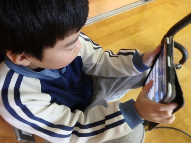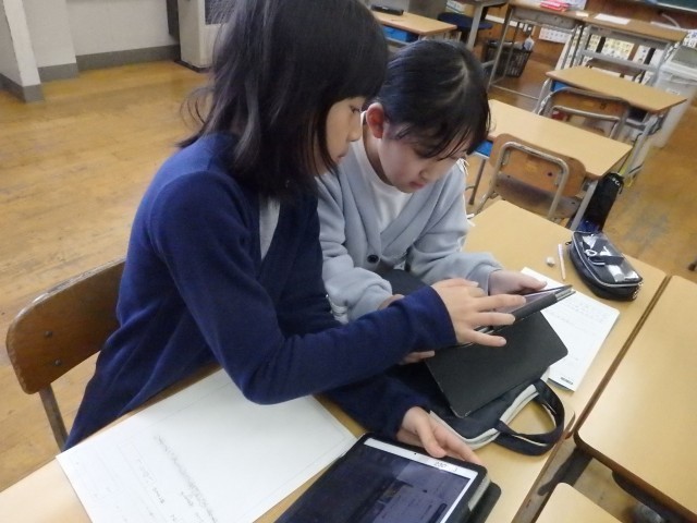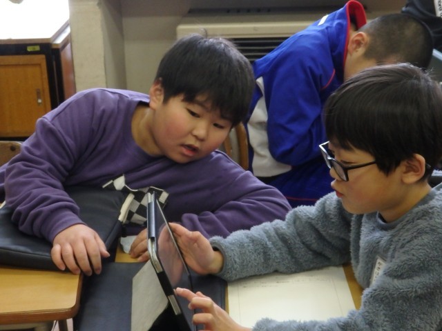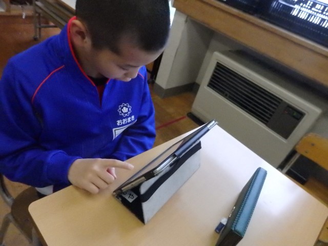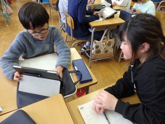 2年生の5時間目は図工の授業でした。「トントンどんどんクギ打って」で作った作品を写真に撮って、iPadのオクリンクプラスというアプリで提出しました。1人1人の作品をiPadの画面上で鑑賞できるようになります。iPadの操作を教え合ったり、一緒にみんなの作品を鑑賞したりしていました。