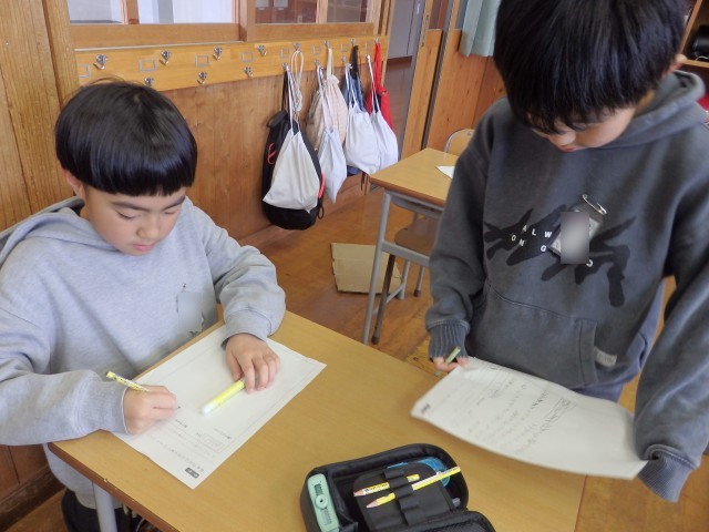 3年生の1時間目は国語の授業でした。「クラスの思い出作りのために」という学習です。実際に3年生の思い出を作るために、クラスでどんなことをしたらいいと思うかという提案文を書いていました。サッカー、バスケ、雪合戦、お絵かき伝言ゲーム、シール交換会、きつね狩りなどいろいろな提案文が書かれていました。自分の「やりたい」気持ちだけを書くのではなく、「それによってどんないいことがあるのか」などの理由もしっかり書いていました。