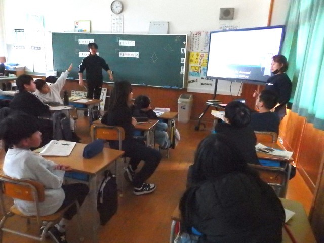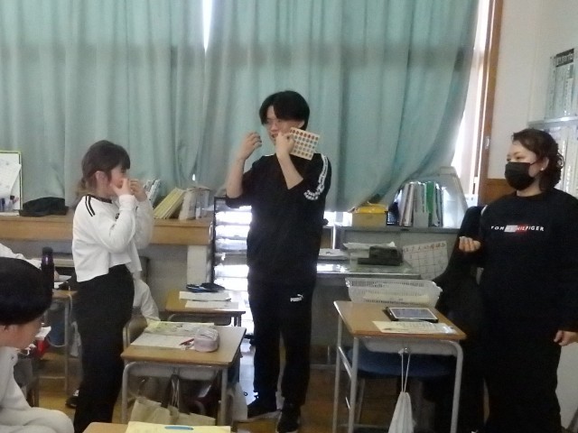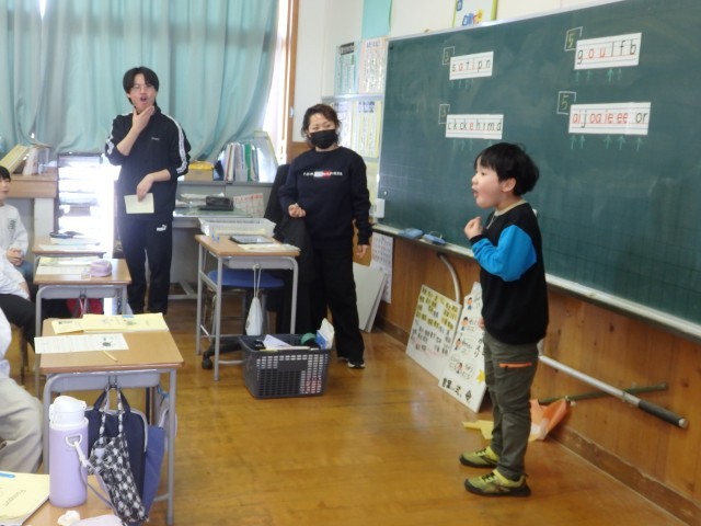 3年生の3時間目は国際科の授業でした。ALTの先生と英語の読み方の学習です。まずは、これまで学習した「s」「a」「ia」などの読み方を復習しました。その後、2チームに分かれてゲーム形式で「pat」「pet」「pit」など3文字の組み合わせでどう読むのかを学習しました。