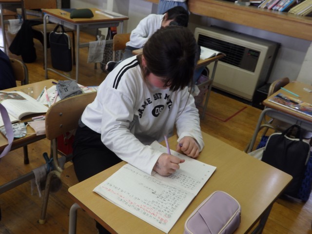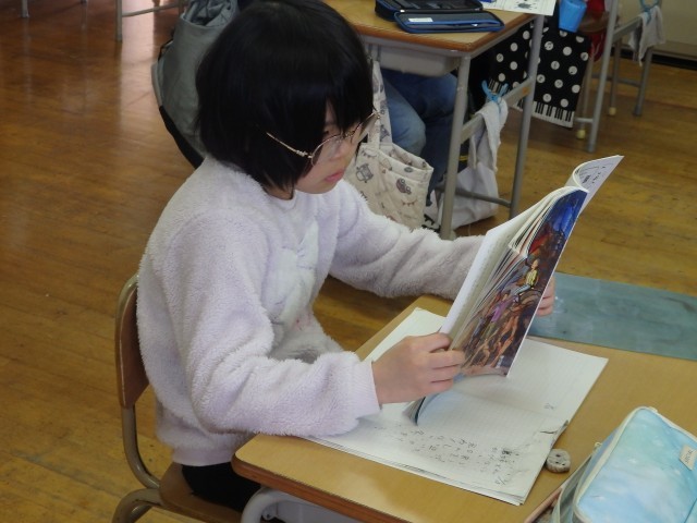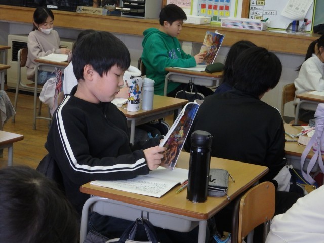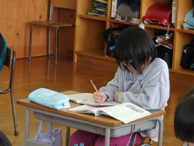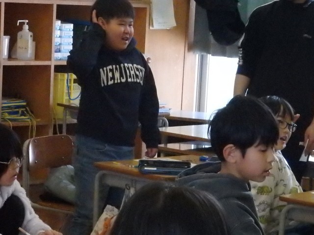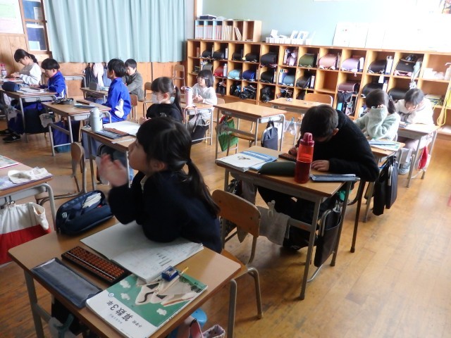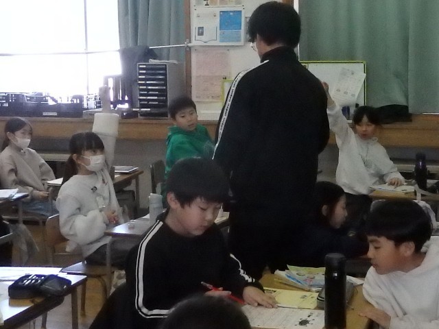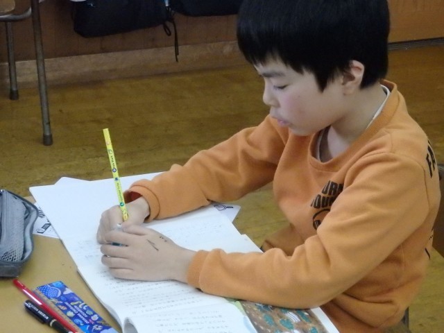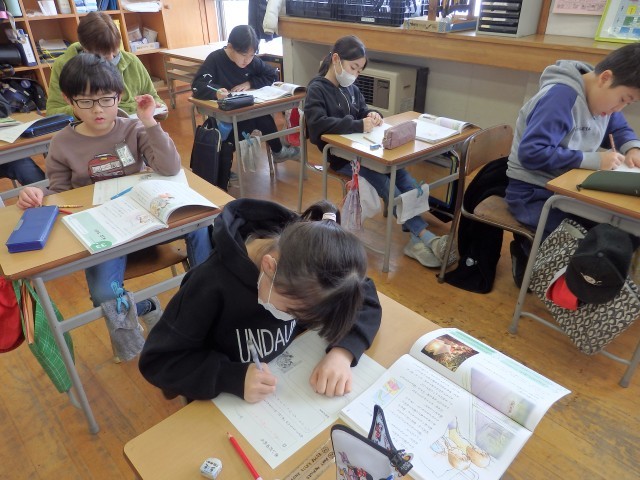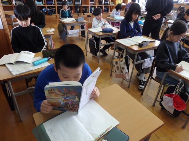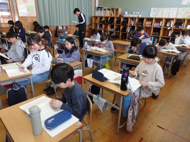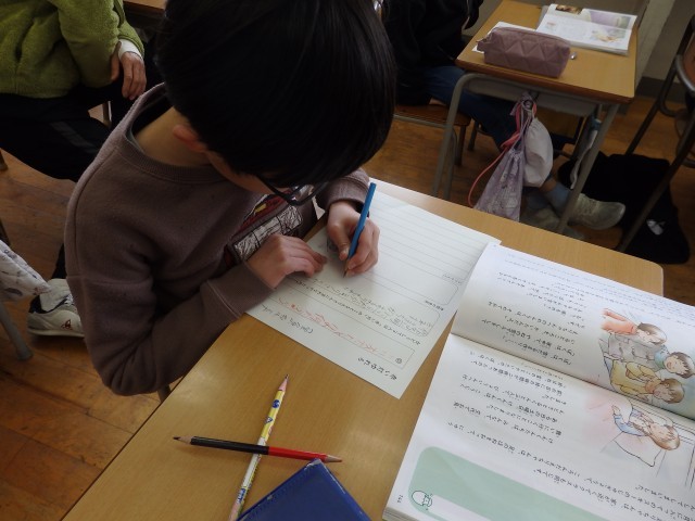 3年生の1時間目は国語の授業でした。「クラスの思い出作りのために」という学習です。実際に3年生の思い出を作るために、クラスでどんなことをしたらいいと思うかという提案文を書いていました。サッカー、バスケ、雪合戦、お絵かき伝言ゲーム、シール交換会、きつね狩りなどいろいろな提案文が書かれていました。自分の「やりたい」気持ちだけを書くのではなく、「それによってどんないいことがあるのか」などの理由もしっかり書いていました。