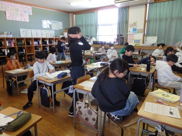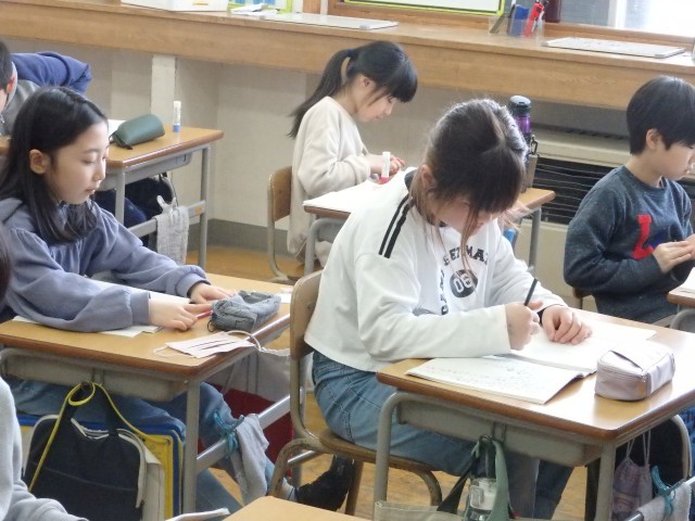 3年生の1時間目は学活の授業でした。2,3月の生活目標「感謝の気持ちを伝えよう」の取組である「ありがとうメッセージ」を書いていました。クラスの友だちやひまわり班の人、登校班の5,6年生に宛てて、「~のとき○○してくれてありがとう」と感謝の気持ちを丁寧に書いていました。配られた3枚のカードに書き終わって「もっと書いていいのかな?」と話している子がいました。