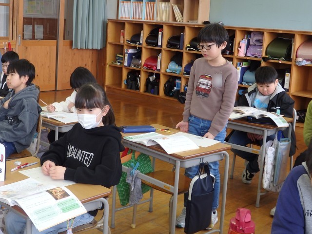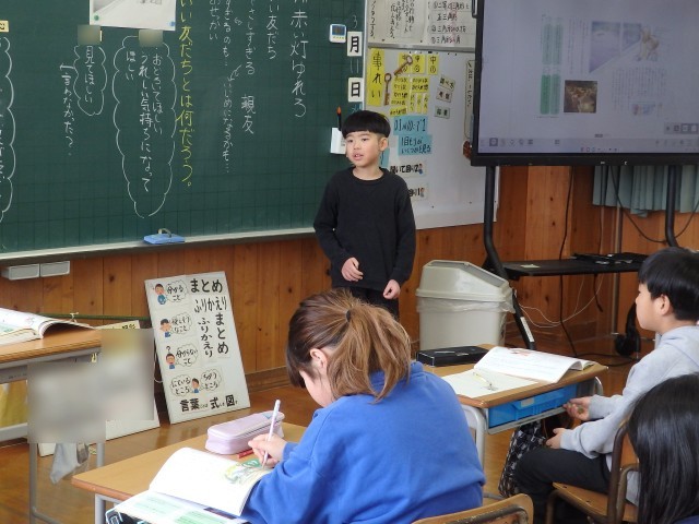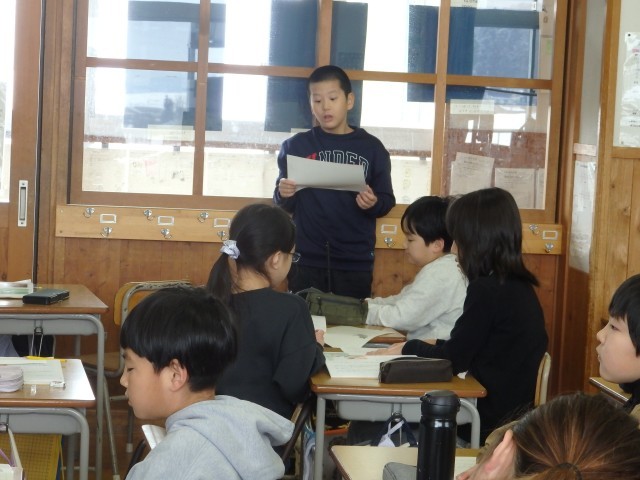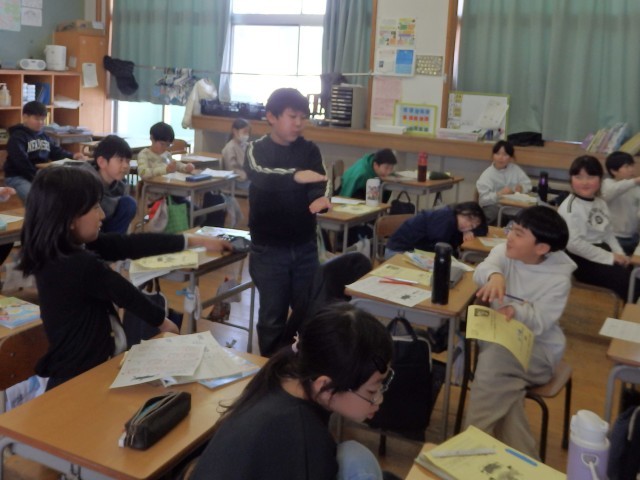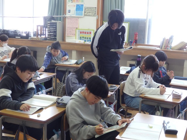 3年生の2時間目は国語の授業でした。「クラスの思い出づくりのために」という学習です。前の時間には「思い出を作るためにどんなことをしたらよいか」について、自分の提案を意見文として書きました。今日は意見文を班ごとで発表していきました。笑顔で発表していたり、発表が終わるとみんなで拍手したりする姿がいいですね。