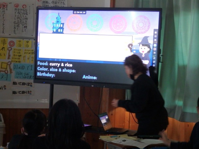 3年生の3時間目は国際科の授業でした。まずはALTの先生と、これまでの国際科の授業で学習した「er」や「ai」などの読み方についてビンゴをしながら復習しました。その後、英語で「好きな食べ物」「好きな色」「誕生日」「好きなマンガ・アニメ」をヒントで出し、どの先生なのかを当てる「誰でしょう」クイズを行いました。私についての問題も出題されましたが、みんなが「誰?」と悩む中、こちらをじっと見ている子がいました。するどい!