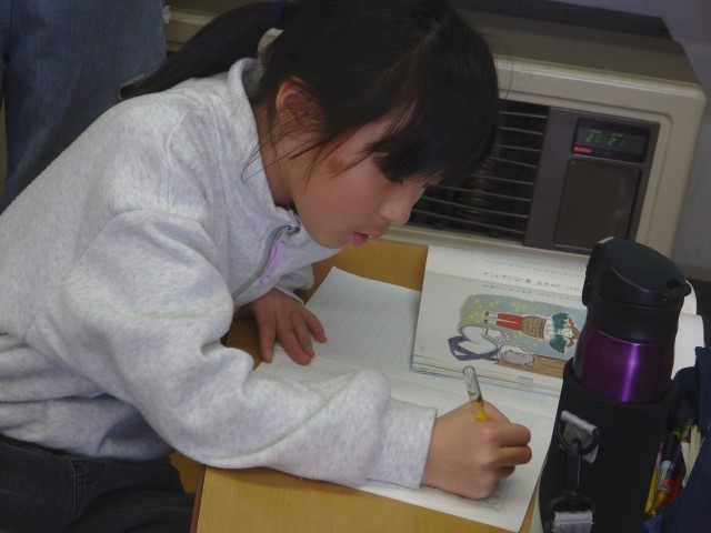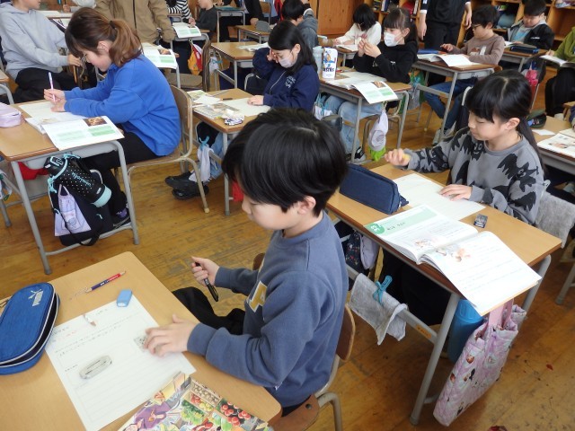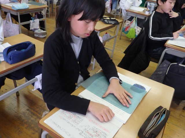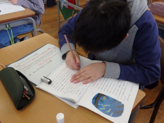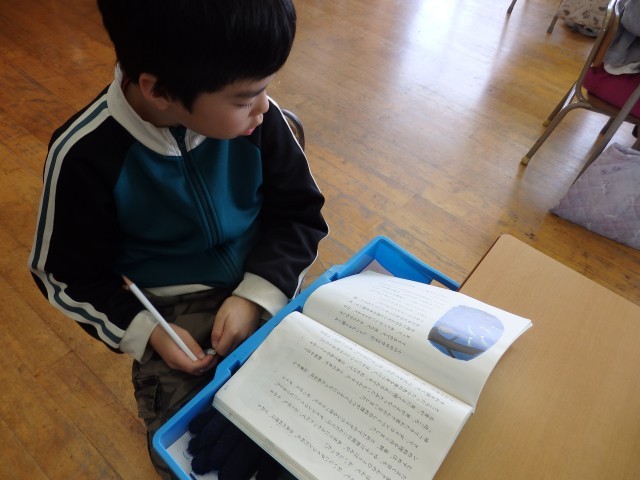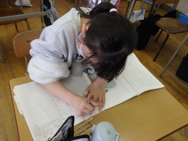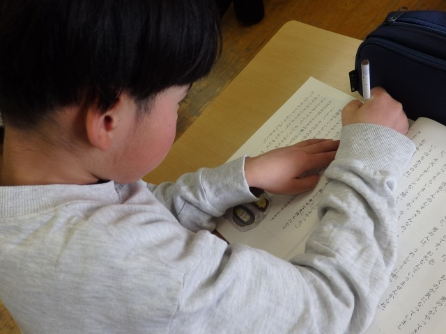 3年生の4時間目は国語の授業でした。「ゆうすげ村の小さな旅館」という物語文の学習です。最初ですので、デジタル教科書で物語を読み上げる音声を聞きながら黙読してから、初めて読んだ感想を書きました。教科書をきちんと持って読んでいる子もいましたが、読めなかった漢字にふりがなを書き込んだり、読み上げられている箇所に下敷きを当てて読み飛ばさないようにしたりなど工夫して読んでいる子がたくさんいました。初読の感想書きでは「5行」と先生からノルマが与えられましたが、それ以上に書いている子がたくさんいました。