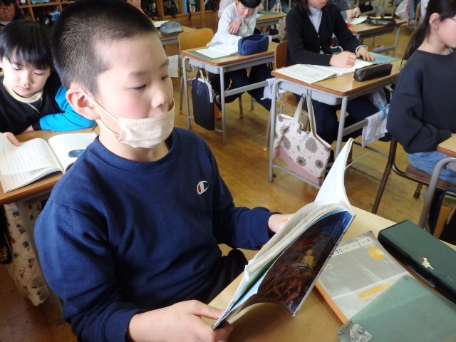 3年生の6時間目は国語の授業でした。「ゆうすげ村の小さな旅館」の学習です。前回の授業で「登場人物の宇佐美がウサギだった」という物語の仕掛けを見つけました。今日は「なぜ、この物語には仕掛けがあるのか」を考えました。物語をもう一度読み返したり、友だちと話し合ったりしながら一人一人がじっくり考えました。