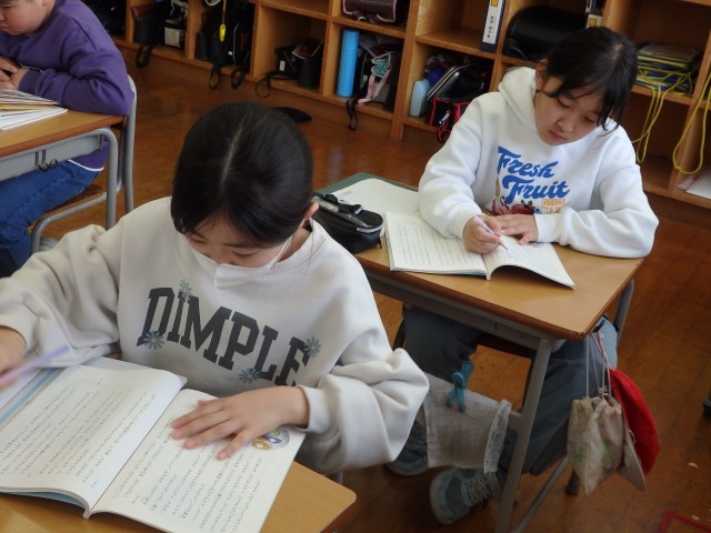 3年生の2時間目は国語の授業でした。「ゆうすげ村の小さな旅館」の学習です。物語全体を丸読みしていました。また、読みながら「時」を表す言葉や文章に線を引き、どこで場面が変わっているのか考えました。