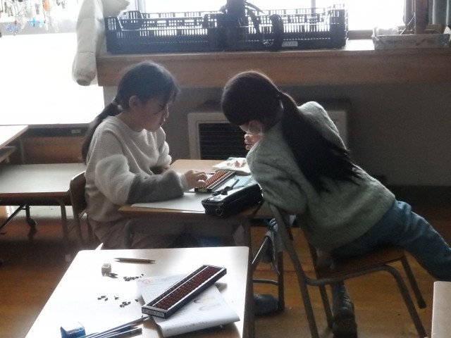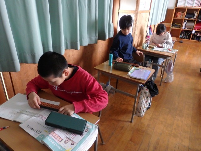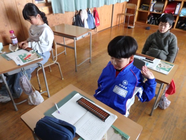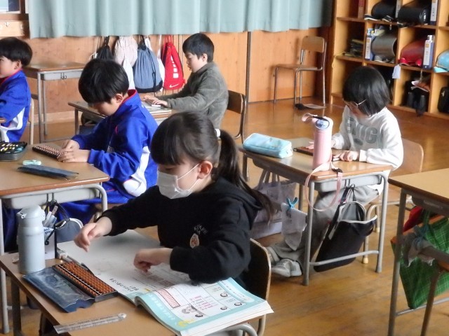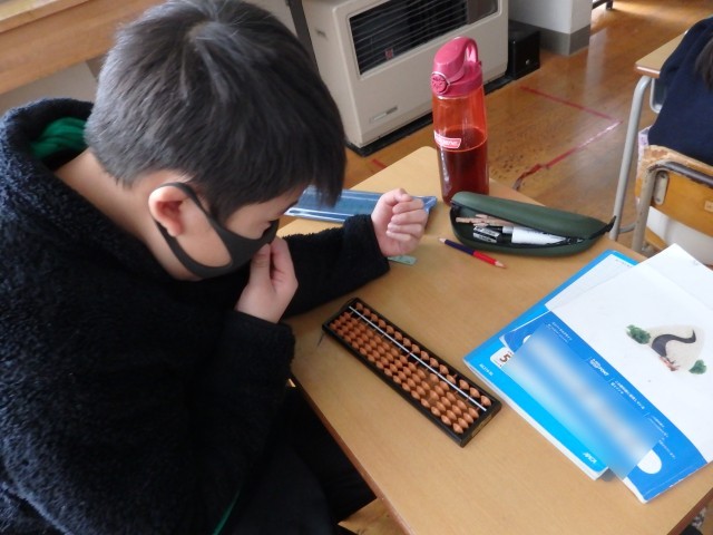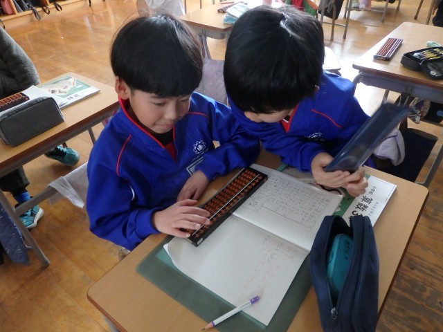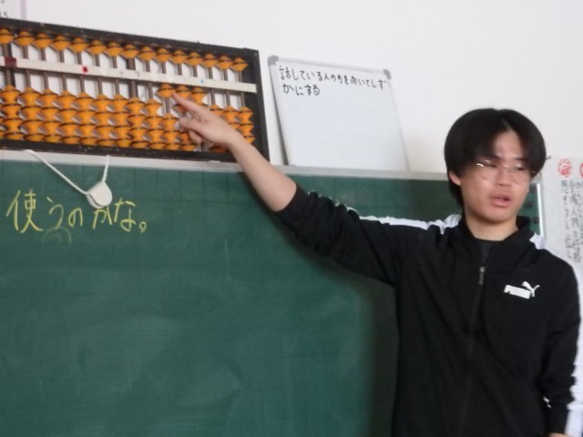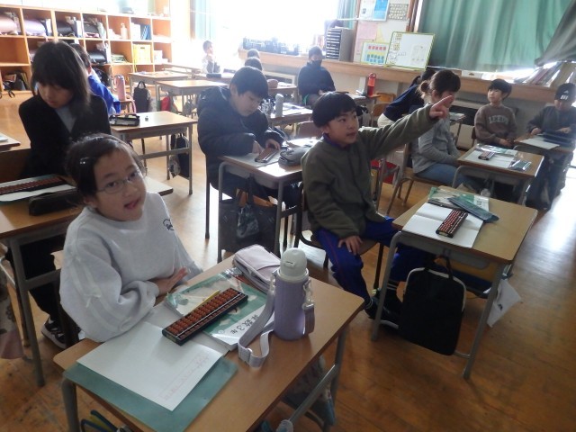 3年生の1時間目は算数の授業でした。そろばんの学習です。初めて使うそろばんですので、「一の位はどこか」、「一の玉と五の玉」、「玉の動かし方」などの基本的なことを学びました。先生が黒板に書いた4,6,27などの数字をそろばんで表しました。