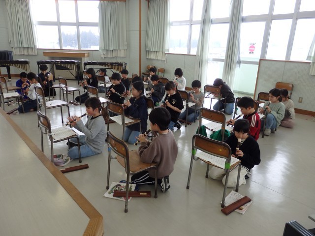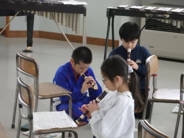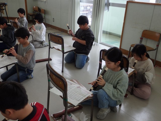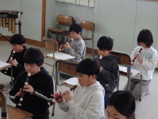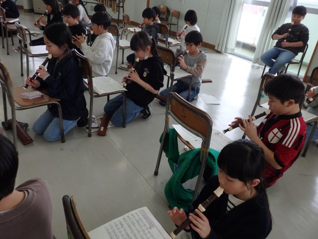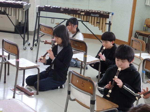 3年生の3時間目は音楽の授業でした。お囃子の学習です。昨日、練習した太鼓のリズムに合わせて、リコーダーでオリジナルの旋律を演奏します。「天テ、ツクツク・・・」を2回繰り返したら役割をチェンジしていきます。班ごとで声を掛け合ったりしながら協力して取り組んでいました。