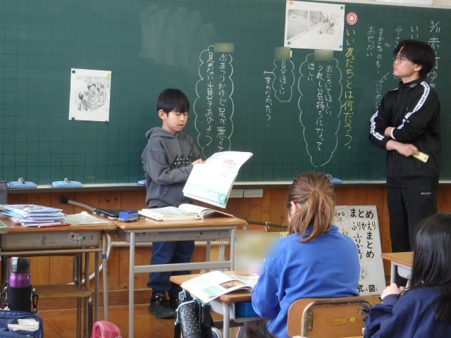 3年生の1時間目は道徳の授業でした。「赤い灯 ゆれろ」という資料を読んで「いい友だちとはどういう友だちか」を考えました。資料は「入院しているえりちゃんのお見舞いにやって来たけん太君たち3人。最近の授業のことを報告すると、すぐ外へ行ってしまいました。不思議に思っていたえりちゃんでしたが、夕方になってお母さんが窓の外に見たのは・・・」という内容です。けん太君たちの行動の意味や理由を考えることで「思いやりのある行動が大切」だと学びました。