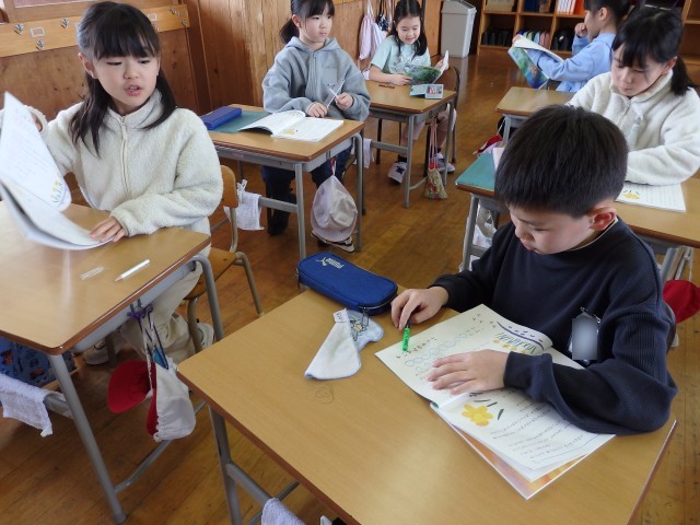 3年生の1時間目は学活の授業でした。2,3月の生活目標「感謝の気持ちを伝えよう」の取組である「ありがとうメッセージ」を書いていました。クラスの友だちやひまわり班の人、登校班の5,6年生に宛てて、「~のとき○○してくれてありがとう」と感謝の気持ちを丁寧に書いていました。配られた3枚のカードに書き終わって「もっと書いていいのかな?」と話している子がいました。