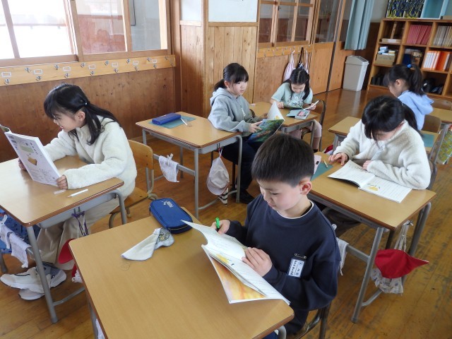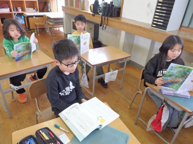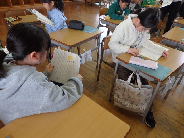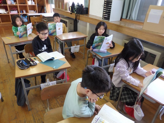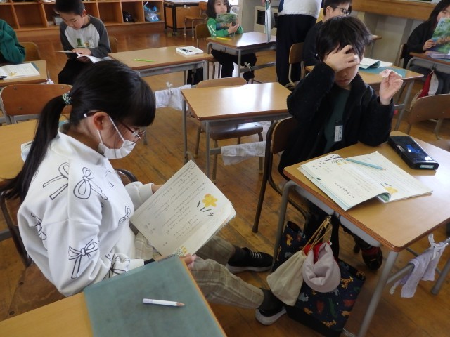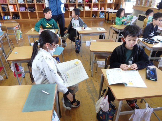 3年生の2時間目は国語の授業でした。「ゆうすげ村の小さな旅館」の学習です。物語全体を丸読みしていました。また、読みながら「時」を表す言葉や文章に線を引き、どこで場面が変わっているのか考えました。
