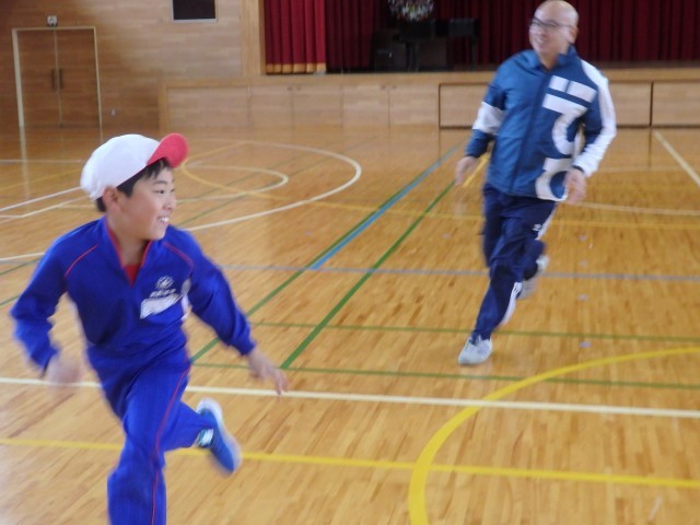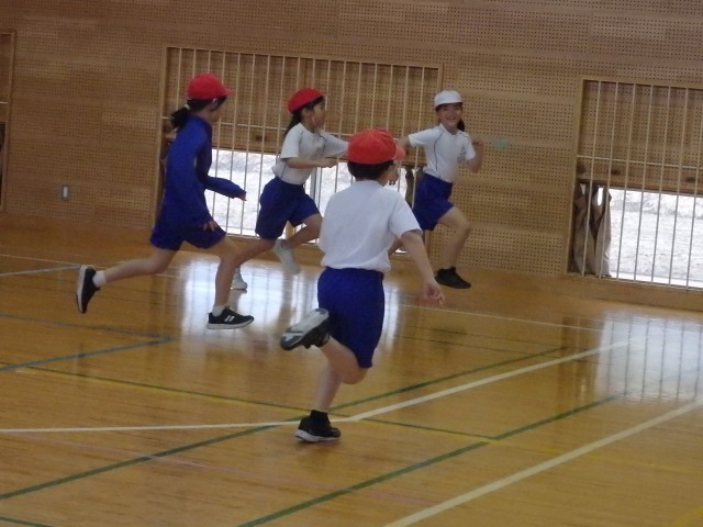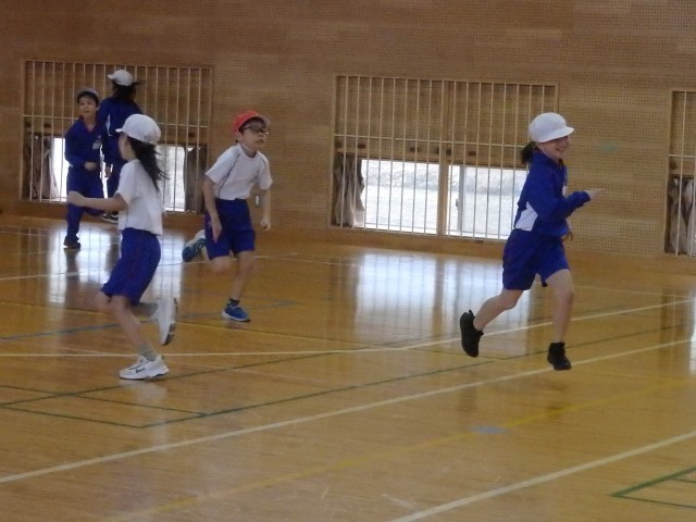 3年生の2時間目は体育の授業でした。素早く整列をする練習をした後、「オニごっこ」を行いました。先生がオニになって「増えオニ」です。とってもいい笑顔で思いっきり体育館を走り回りました。