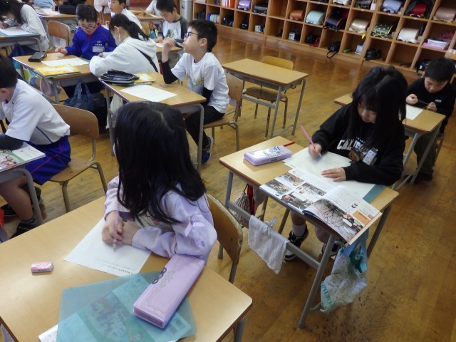 3年生の2時間目は国語の授業でした。「クラスの思い出づくりのために」という学習です。前の時間には「思い出を作るためにどんなことをしたらよいか」について、自分の提案を意見文として書きました。今日は意見文を班ごとで発表していきました。笑顔で発表していたり、発表が終わるとみんなで拍手したりする姿がいいですね。
