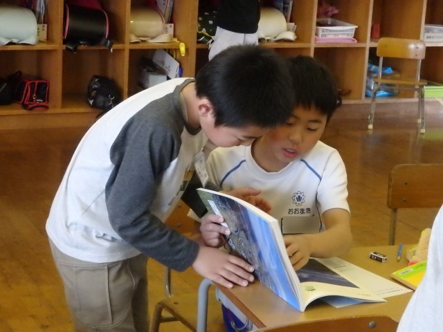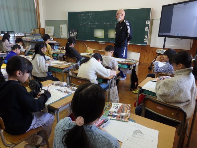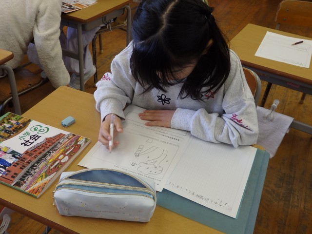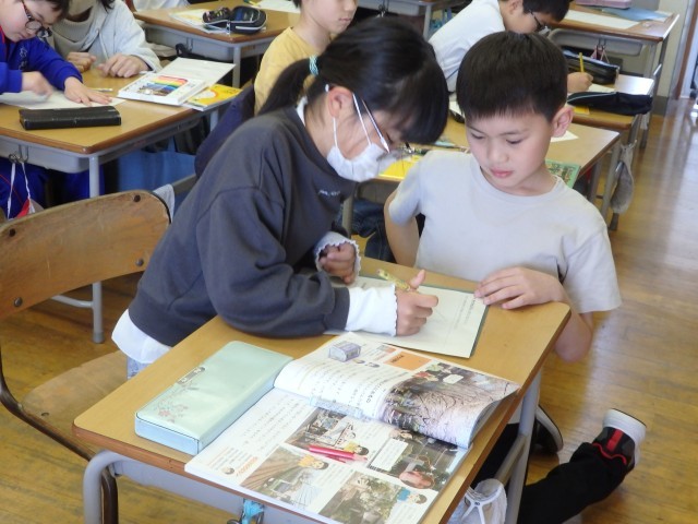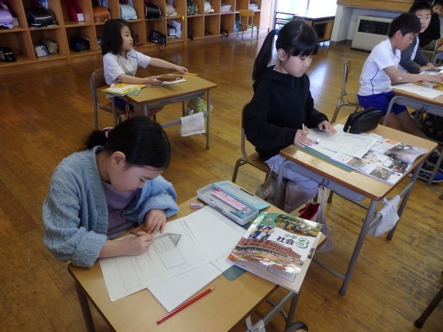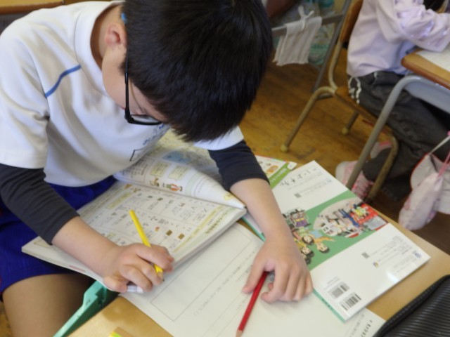 3年生の3時間目は社会の授業でした。教科書に載っている町の様子が描かれているイラストを見て、どんな建物や人がいるのかノートに書き出していきました。「3年生だから3つ」ということで、3つ書き出した子から先生に見せに行きました。その後はさらに町にあるものを見つけようと挑戦したり、3つ見つけられていないこの相談に乗ってあげたりしていました。