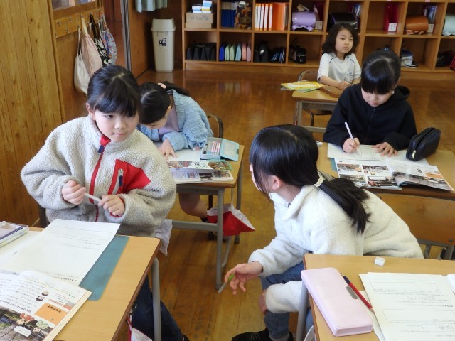 3年生の1時間目は国語の授業でした。「南魚沼市の魅力を説明しよう」という学習を国語と総合の授業をコラボして行っています。総合の授業では南魚沼市の魅力にはどんなものがあるか調べ、国語の授業で各自が選んだテーマに沿って魅力を説明する文を考えます。同じテーマの子でグループになり、模造紙にまとめます。写真や絵で視覚に訴えたり、クイズを入れたりと工夫していました。