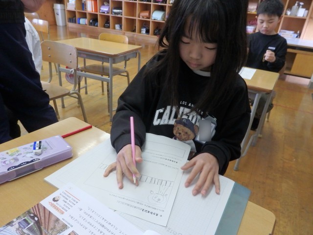 3年生の2時間目は国語の授業でした。「ゆうすげ村の小さな旅館」の学習です。物語全体を丸読みしていました。また、読みながら「時」を表す言葉や文章に線を引き、どこで場面が変わっているのか考えました。
