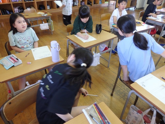 3年生の1時間目は道徳の授業でした。「赤い灯 ゆれろ」という資料を読んで「いい友だちとはどういう友だちか」を考えました。資料は「入院しているえりちゃんのお見舞いにやって来たけん太君たち3人。最近の授業のことを報告すると、すぐ外へ行ってしまいました。不思議に思っていたえりちゃんでしたが、夕方になってお母さんが窓の外に見たのは・・・」という内容です。けん太君たちの行動の意味や理由を考えることで「思いやりのある行動が大切」だと学びました。