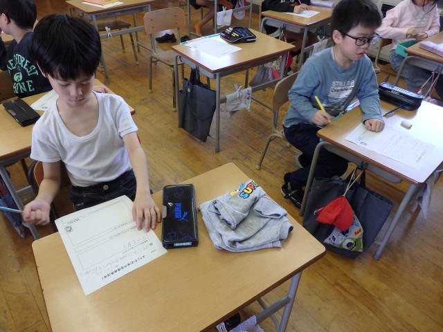 3年生の3,4時間目の学活です。給食当番や係活動の分担を決めました。給食当番決めでは多数決で「くじびき」で決めることになり、先生がネームプレートを使って1人ずつ引いていきました。ワクワクドキドキの顔で待ち、自分の名前が呼ばれると「やったー!」と喜ぶ子どもたちでした。また、係活動の分担決めでは「誰かネームプレートを配ってくれる?」と先生が言うとババッと一斉に手が挙がり、手分けして配ってくれました。いいですね。