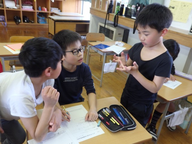 3年生の3時間目は算数の授業でした。「かけ算のきまりを使って、8×7の答えの求め方を説明しよう」という学習です。自分で考えた解き方をノートに書き、3人の人にノートを見せながら説明します。説明したら、相手からサインをもらいます。「それいいね!」「めっちゃ分かりやすい!」などの声があがっていました。