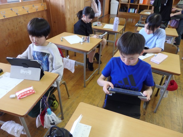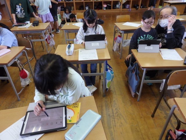 3年生の4時間目は国語の授業でした。「ゆうすげ村の小さな旅館」という物語文の学習です。最初ですので、デジタル教科書で物語を読み上げる音声を聞きながら黙読してから、初めて読んだ感想を書きました。教科書をきちんと持って読んでいる子もいましたが、読めなかった漢字にふりがなを書き込んだり、読み上げられている箇所に下敷きを当てて読み飛ばさないようにしたりなど工夫して読んでいる子がたくさんいました。初読の感想書きでは「5行」と先生からノルマが与えられましたが、それ以上に書いている子がたくさんいました。