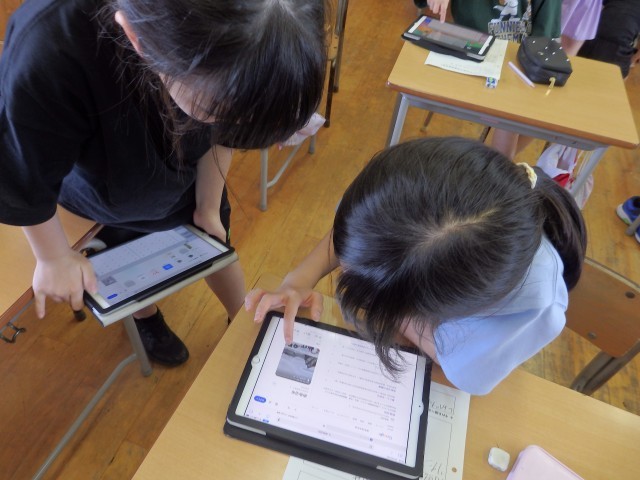 4年生の3時間目は国語の授業でした。「調べたことを報告しよう」の学習です。クラスのみんなに「好きな教科」「好きなスポーツ」「好きな曜日」など、自分でテーマを決めてアンケートを取りその結果をまとめてきました。さらに、まとめたものをAIに読み込ませ、AIが作成した解説動画を参考にして、発表用の原稿を作っています。原稿ができあがった子から発表の練習をしていました。