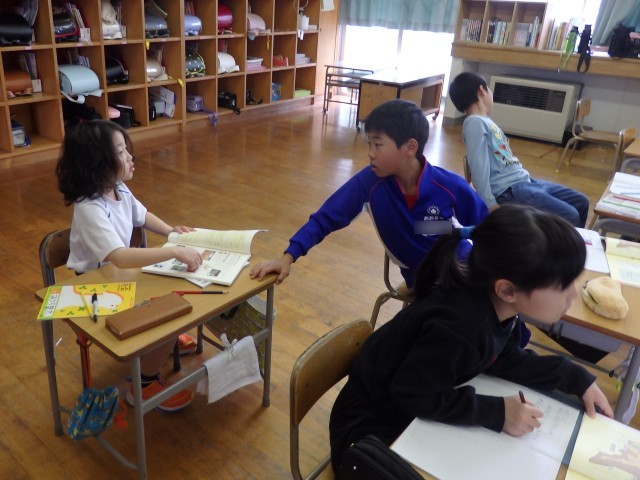 3年生の3時間目は社会の授業でした。教科書に載っている町の様子が描かれているイラストを見て、どんな建物や人がいるのかノートに書き出していきました。「3年生だから3つ」ということで、3つ書き出した子から先生に見せに行きました。その後はさらに町にあるものを見つけようと挑戦したり、3つ見つけられていないこの相談に乗ってあげたりしていました。