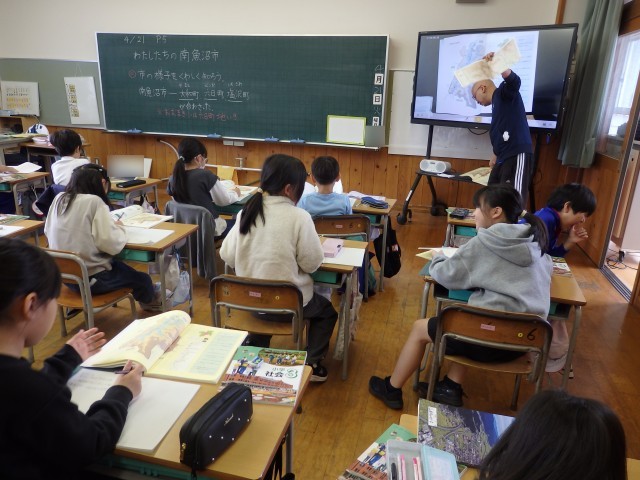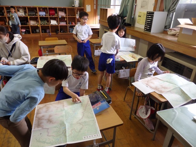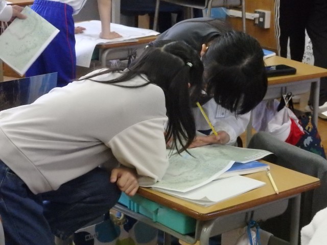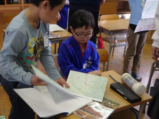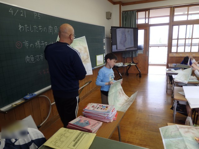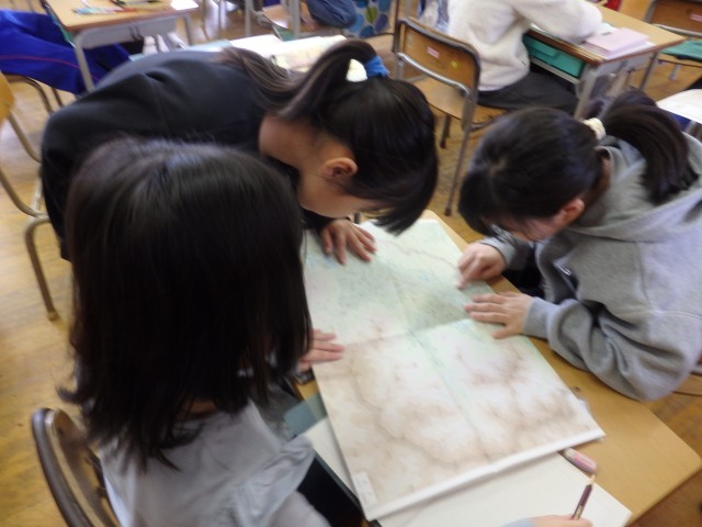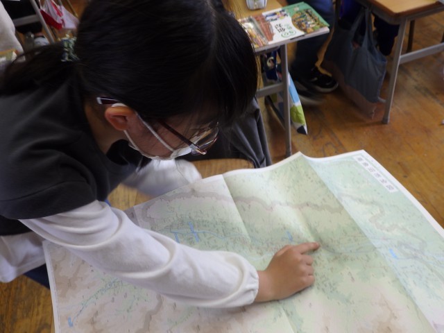 3年生の1時間目は社会の授業でした。「わたしたちの町と市」の学習です。南魚沼市の地図を広げておおまき小学校がどこにあるのか探しました。見つけた人はまだ見つけていない人を助けに行きます。全員、おおまき小学校が南魚沼市の中のどこにあるかが分かったら、次は魚野川が市内をどんなふうに通っているのか調べました。魚野川がいろいろな川と繋がって大きくなっているのを見つけた子がいました。