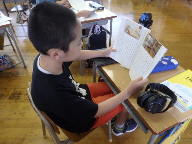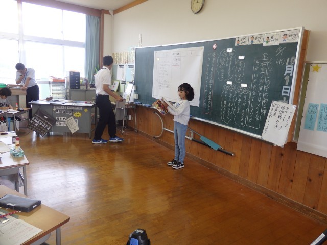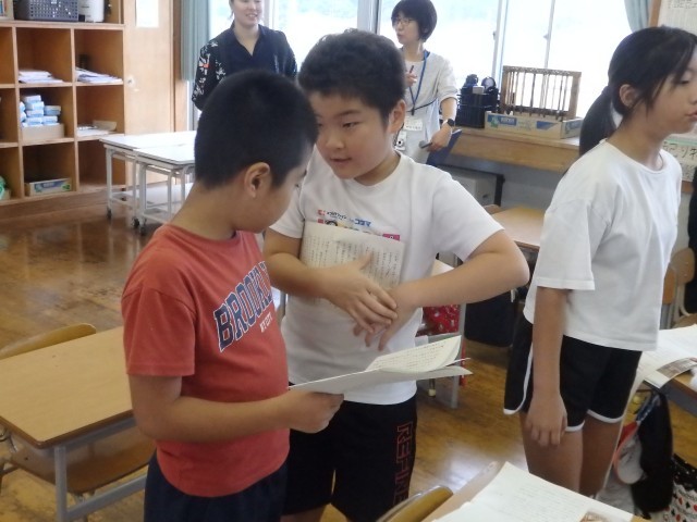 4年生の1時間目は国語の授業でした。「お願いやお礼の手紙を書こう」の学習です。まずは教科書に載っている、ある人が書いたお礼の手紙を音読しました。今日はみんなで一緒に読むのではなく、1分間でどれだけ読めるか競争をしました。1分間、集中して必死に読んでいました。その後、お礼の手紙にはどんなことが書かれているのかを読み取り、発表していきました。教科書のどの部分なのか根拠も明らかにして発表しました。