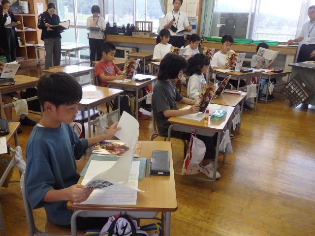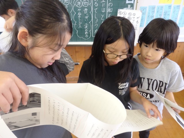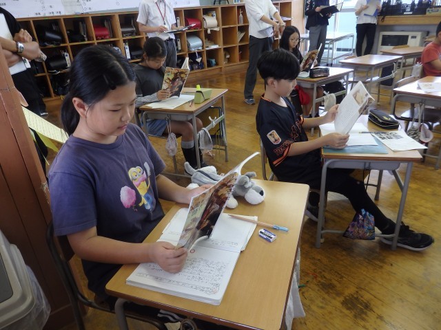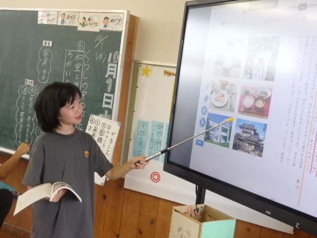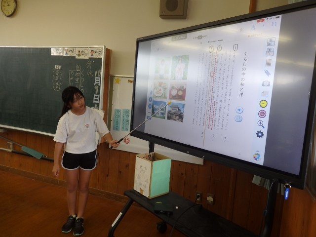 4年生の3時間目は国語の授業でした。市教委にある学習指導センターの指導主事をお招きし、先生たち全員が授業を見る職員研修としての授業です。「暮らしの中の和と洋」の学習です。「和室と洋室にはどんな違いがあるのか」を考えました。「畳」と「椅子」を取り上げて作者が書いている「和室と洋室のよさ」を文中から見つけ出し、比べていきました。それぞれのよさが書かれている文に線を引いて見せ合ったりしました。