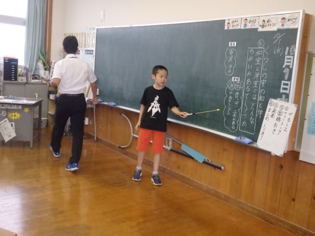 4年生の4時間目は学活の授業でした。2学期の学級づくりです。1学期の学級の様子から課題や反省点を挙げていき、その上で「2学期で目指す姿」を考えました。学級目標にもある「メリハリ」、「協力」、「笑顔」がキーワードになってくるようです。今後の学活では「目標設定シート」を使って、目指す姿と達成のための具体的な取組を考えていきます。