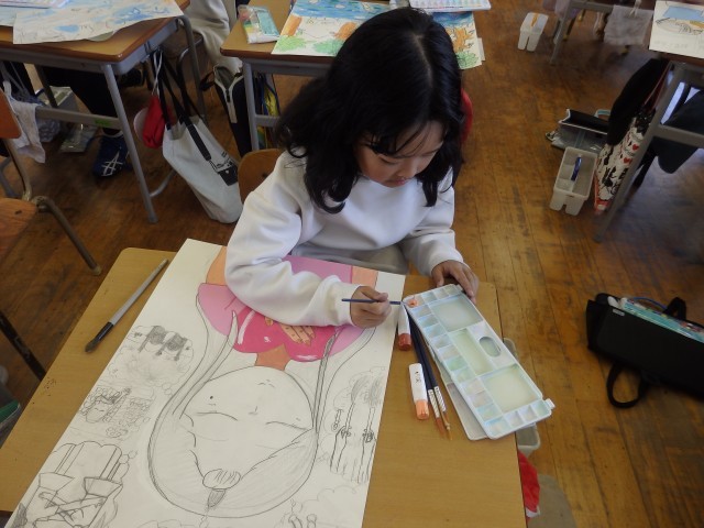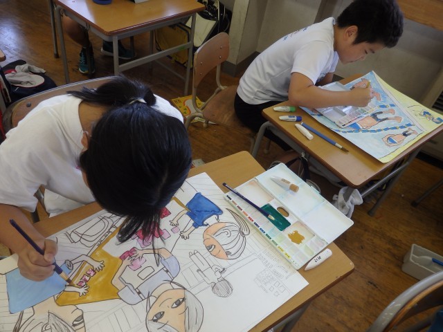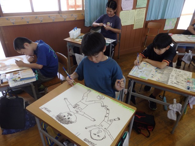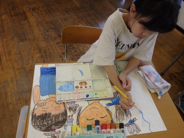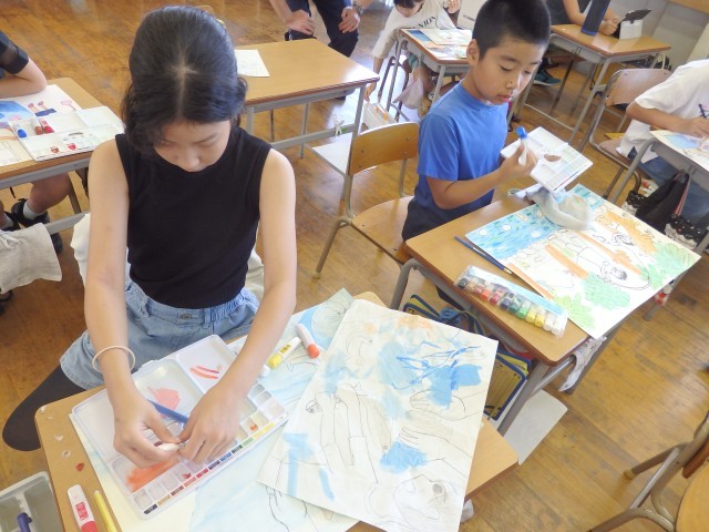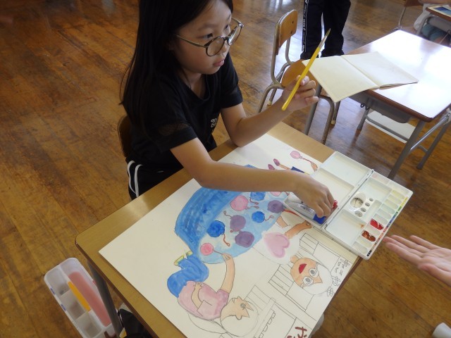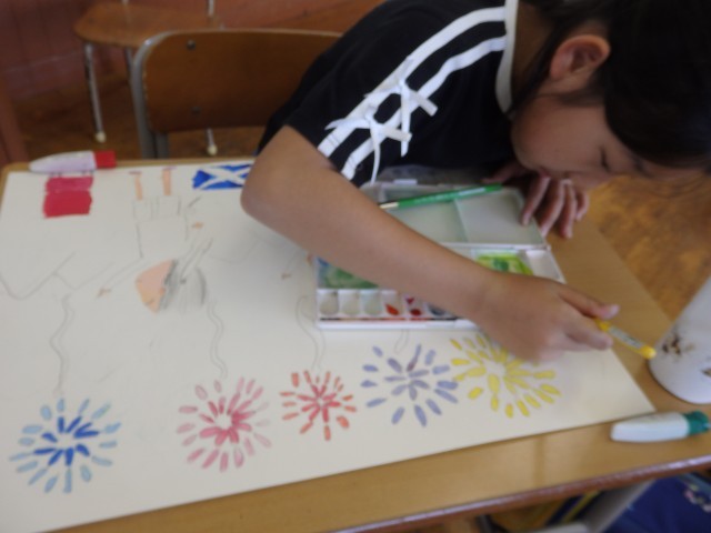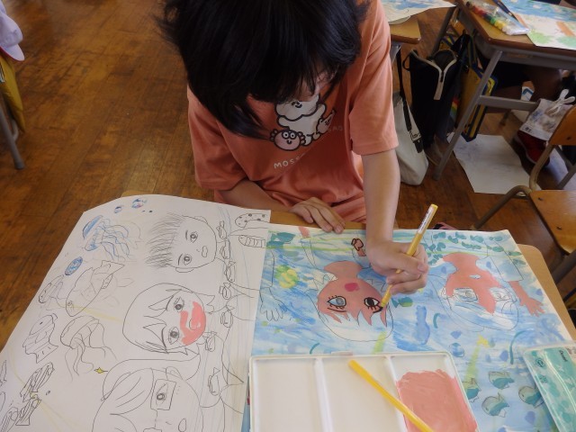 4年生の3,4時間目は図工の授業でした。夏休み中の心に残った出来事を描いていました。花火を見に行ったこと、釣りをしたこと、祭りに行ったこと、水族館に行ったこと、魚のつかみ取りをしたこと、大阪万博に行ったことなどを描いていました。水族館の魚を見ている自分を水槽の中の魚の視点で描くというすごいアイデアの構図で描いている子がいました。
