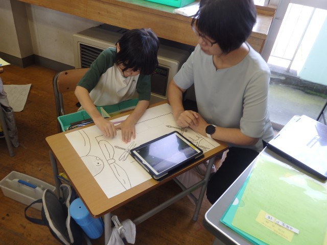 4年生の5時間目は図工の授業でした。思い出の出来事を描いていますが、みんなとても上手なのでビックリしました。描く構図どおりにポーズをとってもらい写真を撮ったり、描きたい風景やしゃがんでいる姿などを画像検索したりなど、iPadを上手く活用していました。