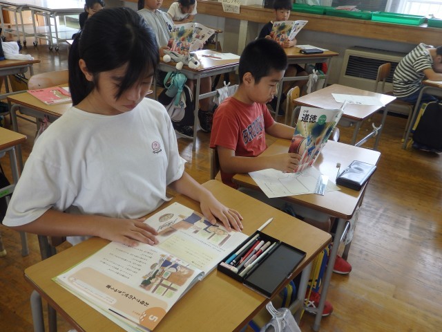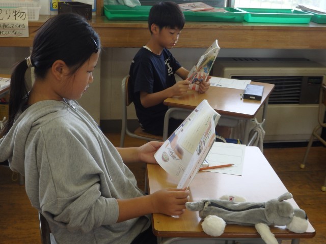 4年生の4時間目は国語の授業でした。「暮らしの中の和と洋」の学習です。まずはみんなで丸読みです。とってもいい表情で上手に読んでいる子がたくさんいました。そして、今日から「和と洋の【衣】と【食】のよさを調べよう」というまとめの学習に入ります。【衣】か【食】かどちらかを選び、さらにその中の何について調べるのかを決めて、インターネットではなく図書室や市図書館から借りてきた本で調べてまとめていきます。見たい本が重なってしまった場合には一緒に読んだり、譲り合ったりしながら取り組んでいました。