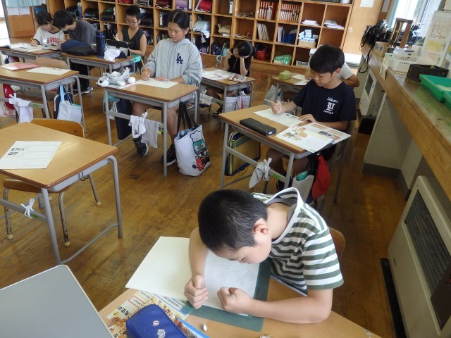 4年生の1時間目は国語の授業でした。「お礼の手紙を書こう」の学習です。手紙の構成である「前文」「本文」「末文」「後付け」を学習した後、金曜日の校外学習でお世話になった県庁の職員の方へお礼の手紙を書きました。見学しながら書いたメモを見返したりしながら、1文字1文字をていねいに書いていました。
