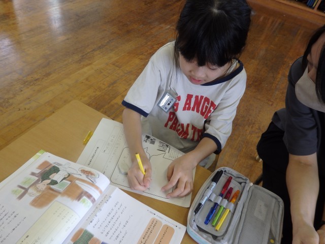 4年生の3時間目は国語の授業でした。「暮らしの中の和と洋」の学習です。まずは昨日の授業の続きで「畳と椅子、自分ならどちらがいいか」で考えを発表していきました。教科書で書かれていた「それぞれのよさ」をふまえて発表することができました。そして今日の学習は「和室、洋室、それぞれの使い方のよさ」について筆者の考えを読み取り、どちらがいいか考えました。「和室派」「洋室派」「どちらもいい派」といましたが、どちらかというと「和室派」が多かったようです。