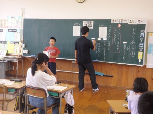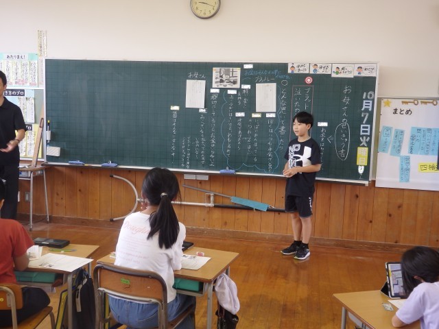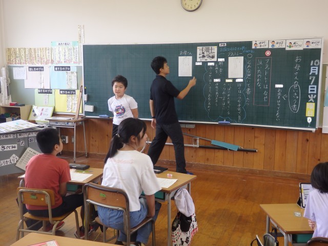 4年生の4時間目は総合の授業でした。学習発表会の発表に関わる役割を決めていました。子どもたちで司会、黒板書記、ノート書記を決めて、子どもたちで話し合いを進めます。先生はときどき進め方についてアドバイスをする役に徹していました。まずは、どんなリーダーが必要なのか意見を出し合いました。出されたたくさんの意見をまとめて「監督」「コーチ」「衣装」「工作」の役割が決まりました。準備や練習などでも、よりよい物を目指して、ぜひ自分たちで考え行動してほしいです。