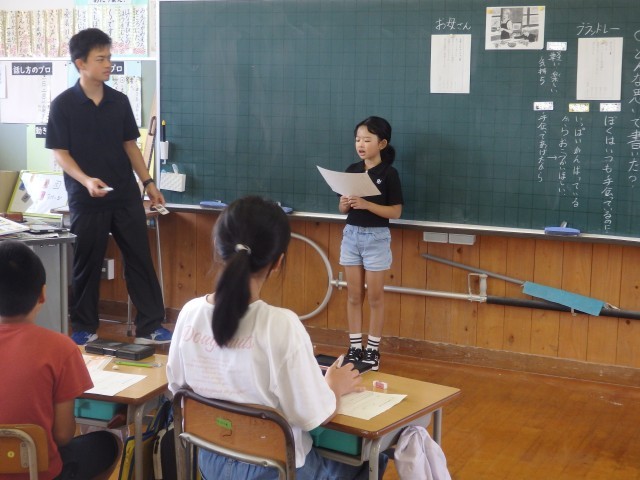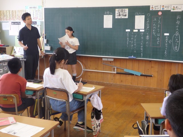 4年生の1時間目は国語の授業でした。「お願いやお礼の手紙を書こう」の学習です。まずは教科書に載っている、ある人が書いたお礼の手紙を音読しました。今日はみんなで一緒に読むのではなく、1分間でどれだけ読めるか競争をしました。1分間、集中して必死に読んでいました。その後、お礼の手紙にはどんなことが書かれているのかを読み取り、発表していきました。教科書のどの部分なのか根拠も明らかにして発表しました。