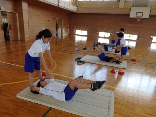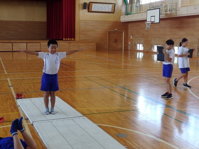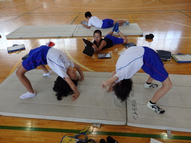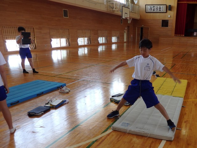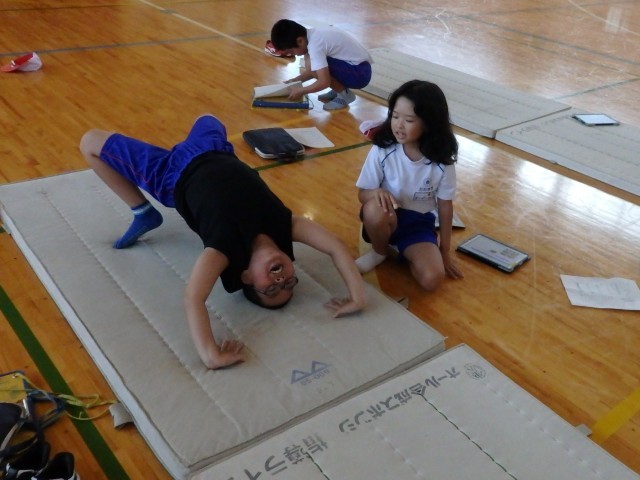 4年生の3時間目は体育の授業でした。まずはウォーミングアップで「王様しっぽ取り」や2人ペアでの足あげ腹筋をして、体を温めてからマット運動です。2人ペアになってお互いの技をiPadで動画撮影し、自分の技を確認したり、先生に送信したりしました。