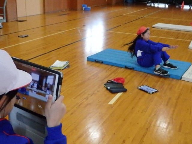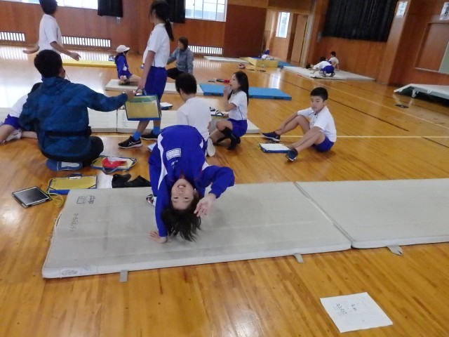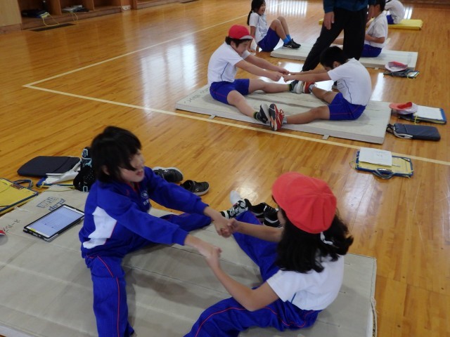 4年生の3時間目は体育の授業でした。まずはウォーミングアップで「王様しっぽ取り」や2人ペアでの足あげ腹筋をして、体を温めてからマット運動です。2人ペアになってお互いの技をiPadで動画撮影し、自分の技を確認したり、先生に送信したりしました。