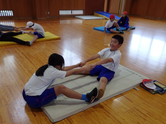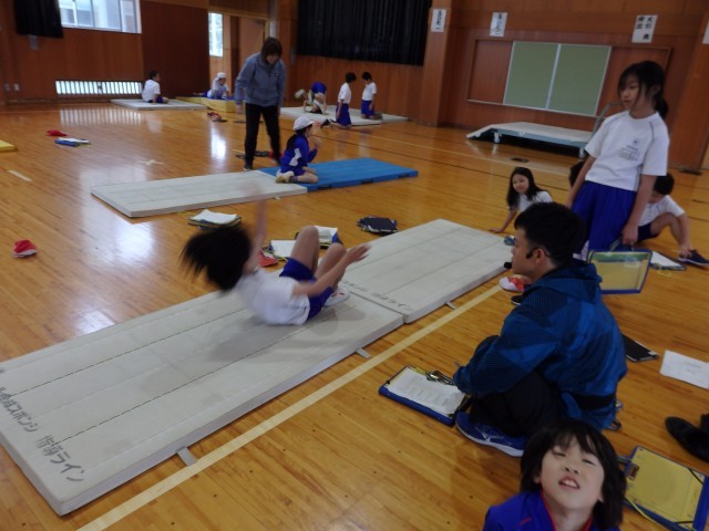 4年生の2時間目は体育の授業でした。今日からマット運動です。まずはウォーミングアップで「王様しっぽとり」をして走りまくりました。その後、マット運動を行いましたが、まずは寝転がった状態から反動をつけて手をつかないで立ち上がったり、2人で背中合わせになって手をつかないで立ち上がったりしました。そしてマット運動です。前転や後転などの技を練習しました。