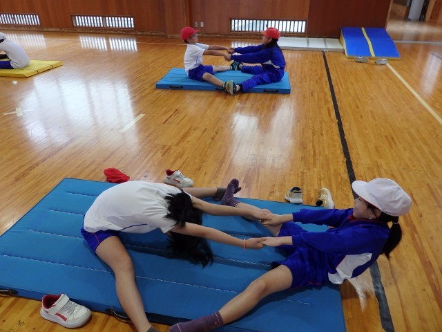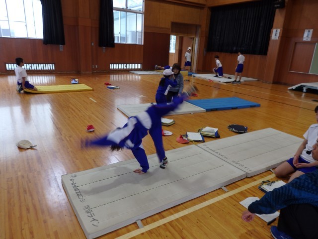 4年生の2時間目は体育の授業でした。マット運動の学習です。まずはウォーミングアップです。2人ペアで柔軟運動をしました。その後、マット運動の技をしているところを動画で撮り合い、技の完成度を確認しました。そして「いける!」と思ったら、先生へ自分の技の審査をしてもらいます。「立ったところからブリッジできるよ」と言って実演してくれた子がいました。すごい!