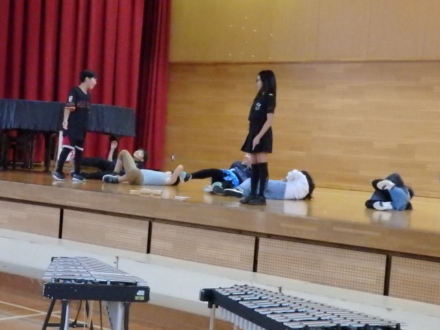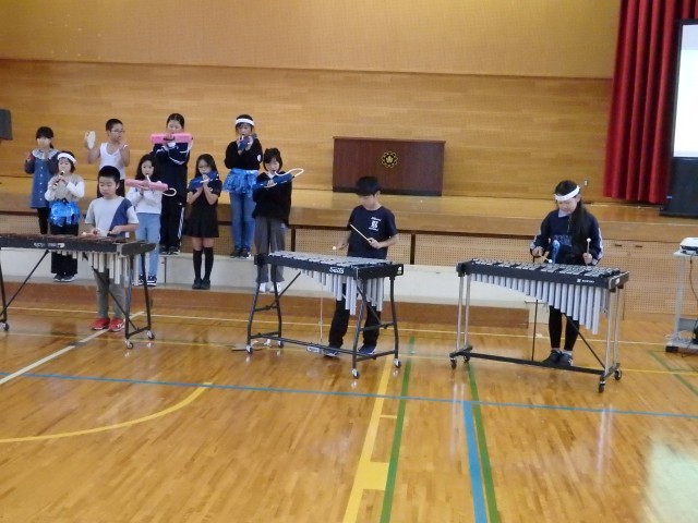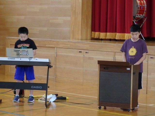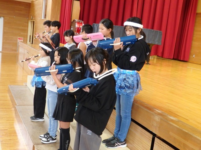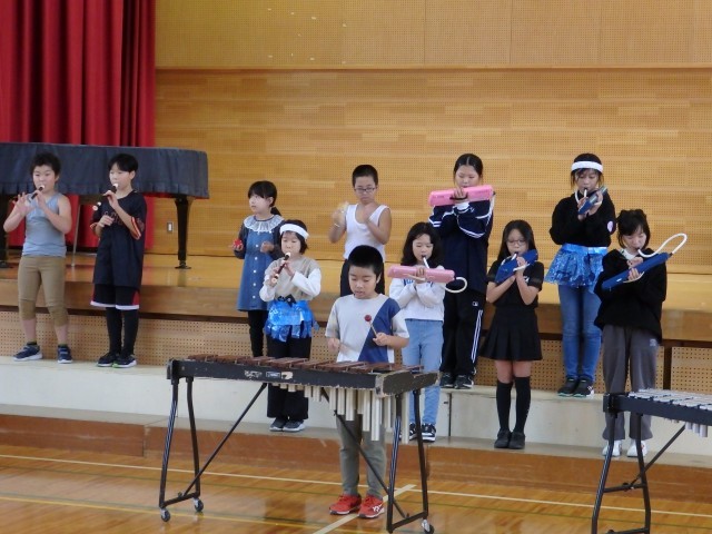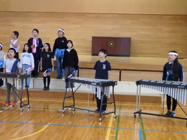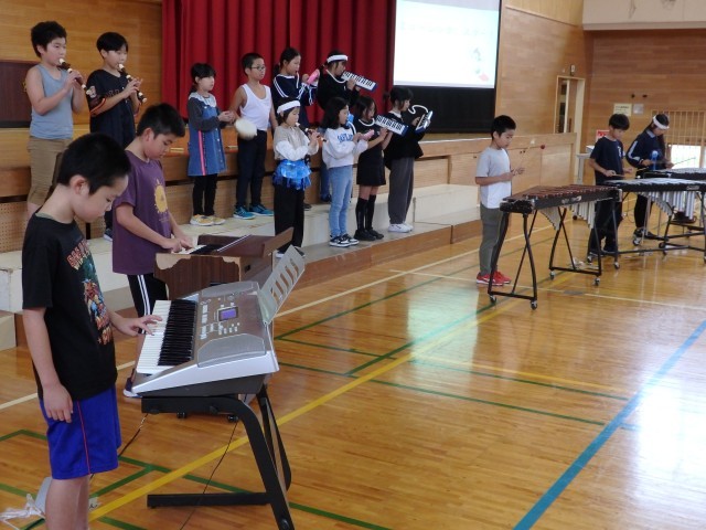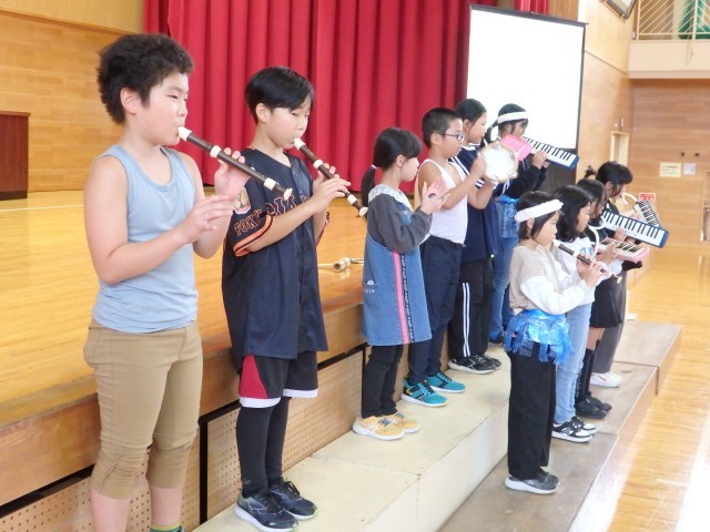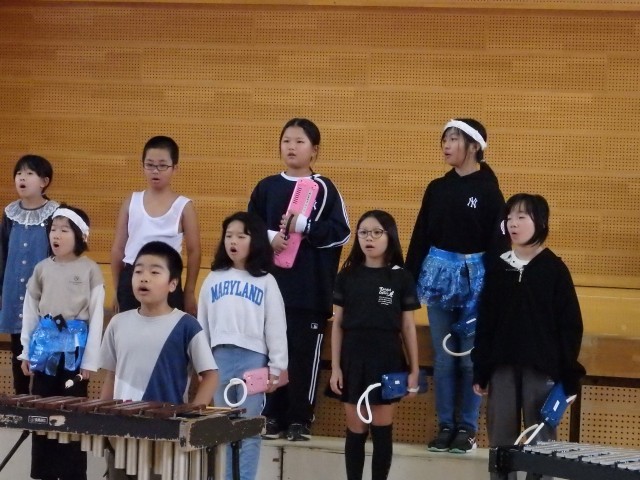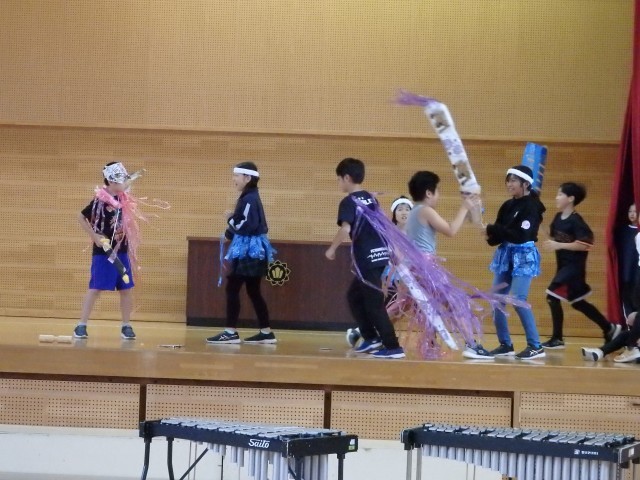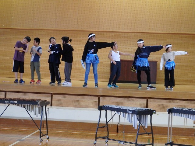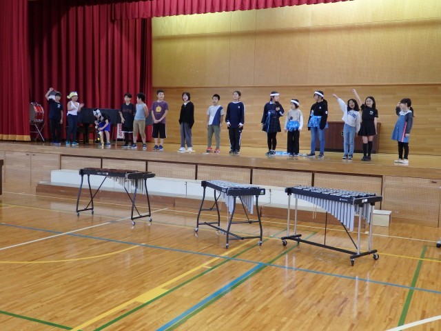 4年生のステージ練習、劇からの流れで合奏に入ります。タイトルは本番をお楽しみに。