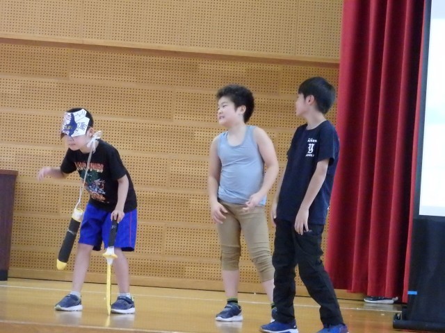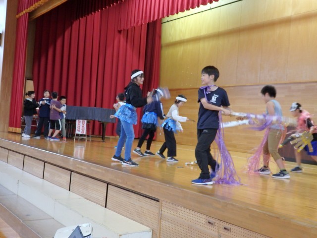昨日の4年生の5時間目は総合の授業でした。学習発表会の準備と練習をしていました。自分たちで考えて意見を出し合い、小道具を準備したり練習を進めたりしていました。