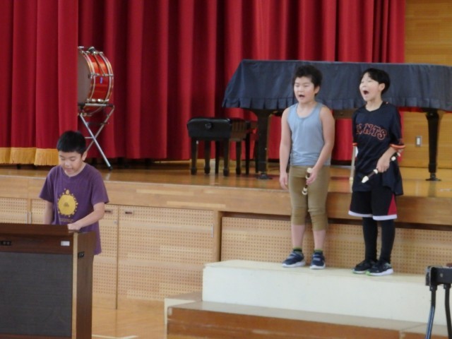 4年生の2時間目は総合の授業でした。学習発表会の練習です。全校の先陣を切ってのステージ練習です。思わず笑ってしまうところや「なるほど~」と思うところなど見所満載です。まだまだ台本を見ながらですが、協力して練習を重ね4年生らしい素敵な発表にしてほしいです。